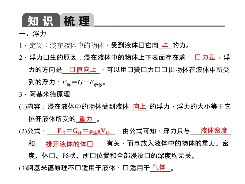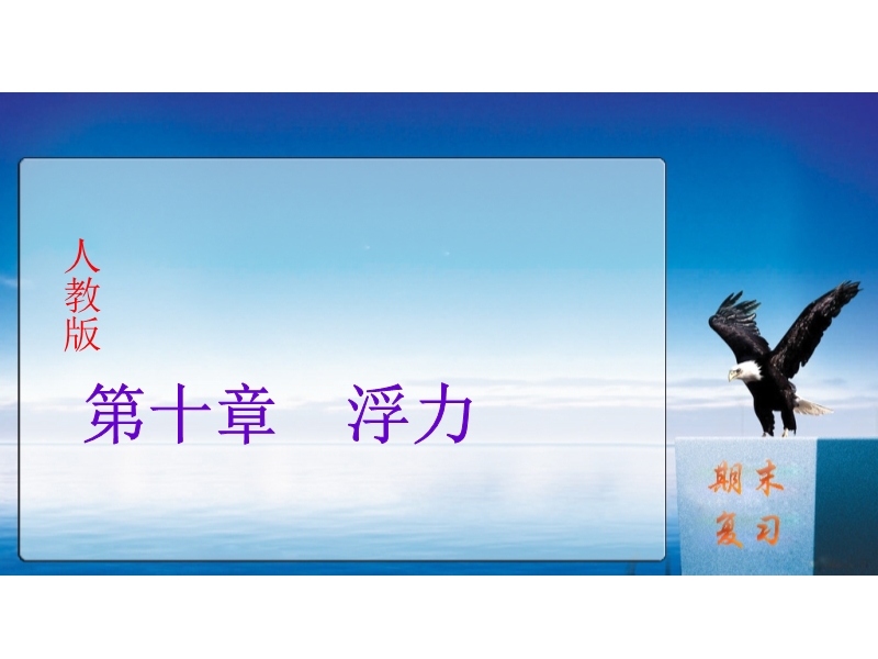 【内容简介】人教版:《第十章 浮力》PPT复习课件,课件共有24张幻灯片,课件分四个部分:1、考点梳理,梳理本章知识要点:浮力、浮力产生的原因、浮沉条件等,2例题精选:课件精选了到2014年中考试题,重在通过例题剖析,分析考点,总结归纳方法。3易错易混环节。