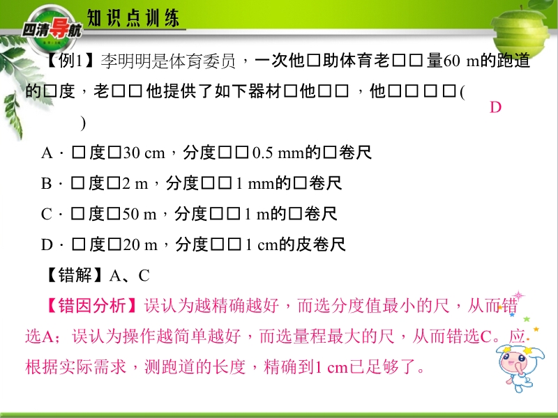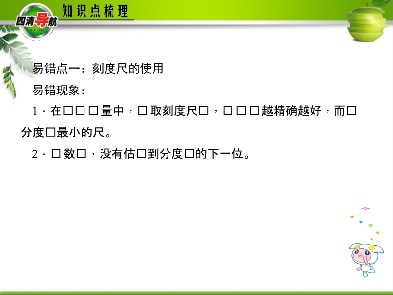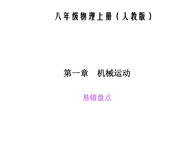 【内容简介】四清导航课件:人教版《第一章 机械运动-易错盘点》知识点训练ppt课件,课件共有11张幻灯片,课件本章一些难点或相近的概念共有点刻度尺的使用、动动、静止的相对性、平均速度的计算:,通过习题列举,教师的点拨讲解,进一步理解教材中易错知识点