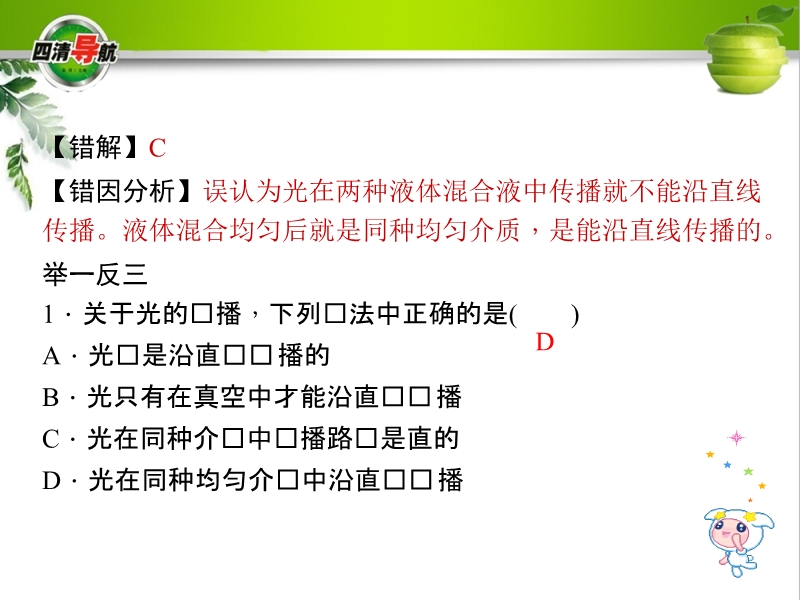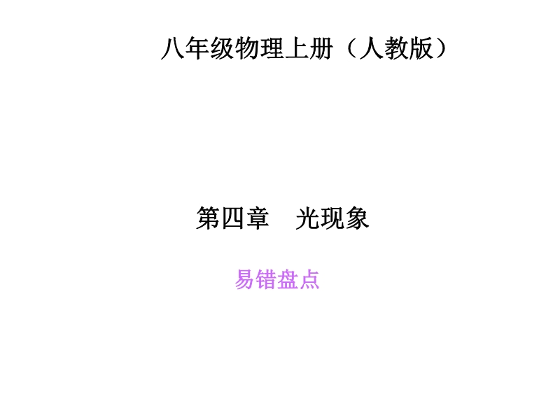【内容简介】四清导航课件:人教版《第四章光现象--易错盘点》知识点训练ppt课件,课件共有11张幻灯片,课件本章一些难点或相近的概念共有易错点一:对光沿直线传播的条件理解不透、易错点二:光的反射、易错点三:光的反射现象与光的折射现象区分不清,通过习题列举,教师的点拨讲解,进一步理解教材中易错知识点.