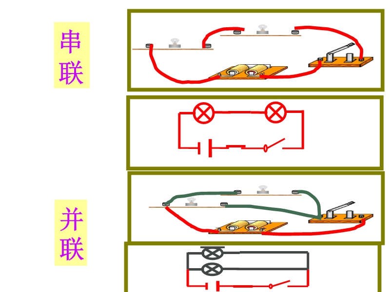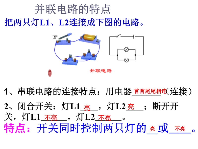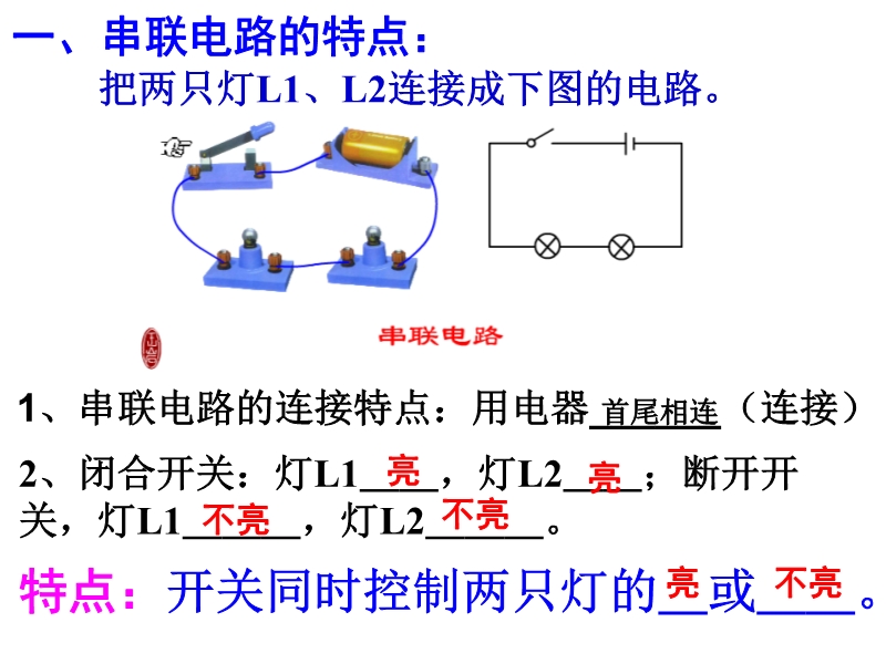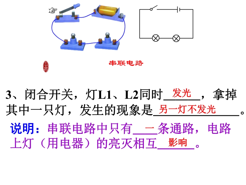 【内容简介】人教版:《15.3串联和并联》PPT课件,共有32张幻灯片。课件从实际问题入手,引导学生认识了串联电路和并联电路,并探究了串联电路和并联电路的特点,并引导学生讨论了如何找出并联电路中的干路和支路等,课件中还有巩固练习。