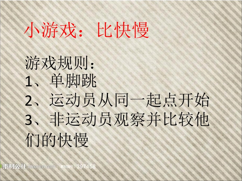 【内容简介】苏北地区赛课:苏科版《 5.2 速度》ppt课件(3)),共有12张幻灯片。课件首先引导学生通过游戏认识物体运动有快慢,讨论了如何比较物体运动的快慢,然后引导学生认识了速度的物理意义、速度的定义及速度的计算公式,讨论了速度的两个单位之间的关系等.