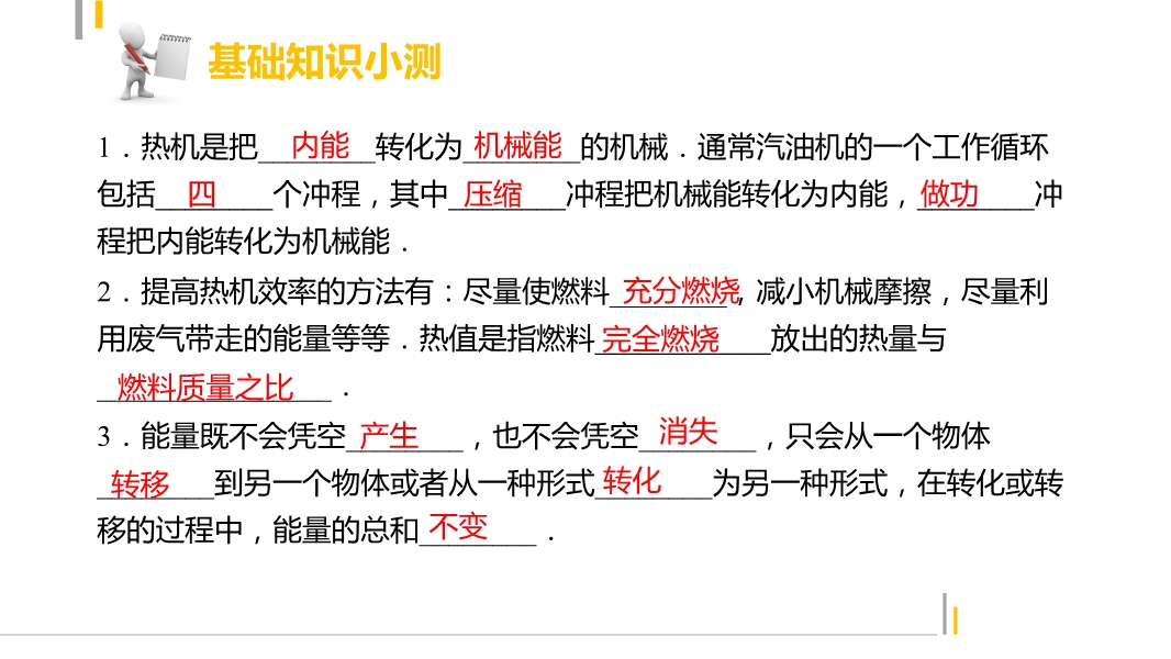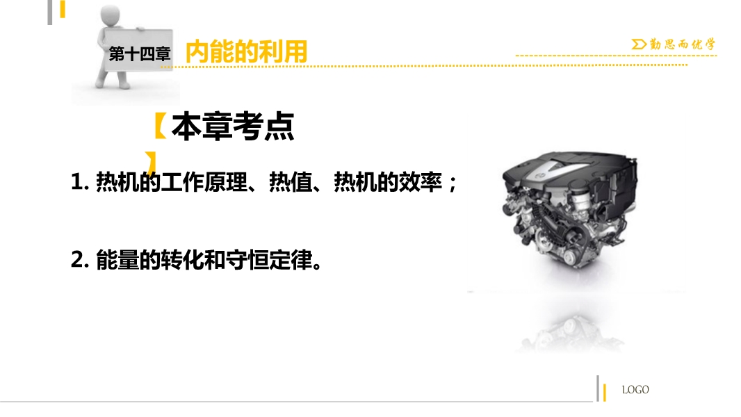 【内容简介】【中考突破】人教版2016年初中物理中考复习课件:《第14章 内能的利用》ppt课件,课件共有21张幻灯片,引导学生认识本章的知识点:1. 热机的工作原理、热值、热机的效率; 2. 能量的转化和守恒定律,通过填空引导学生回顾本章基础知识,课件的重点是按照考点重点突破,引用了2015年中考试题,通过试题的评析,总结解题思路,同时通过全方位突破,提高学生解题能力。