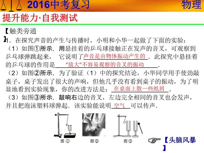 【内容简介】【聚焦中考】广东省人教版2016年中考复习课件:《第2章 声现象》ppt课件,课件共52张ppt幻灯片,课件按知识点:声音的产生和传播、声音的特性、现代技术与声的应用 噪声的防治每个知识点通过巩固基础·自我诊断再现基础知识,热点考向·直击中考列,举2015年中考试题,强化知识点,最后头脑风暴·自我反馈,反思问题提高能力.