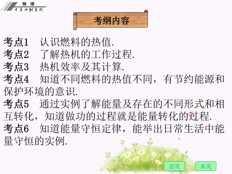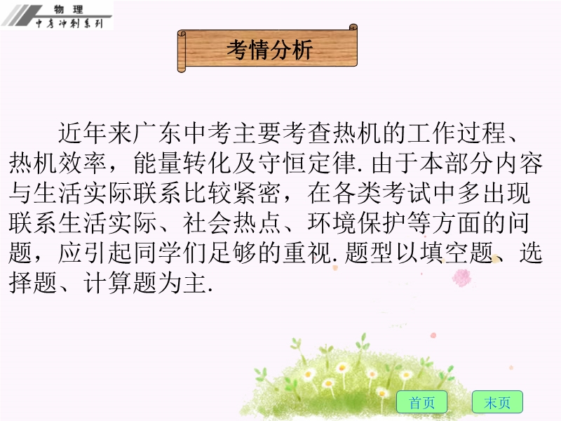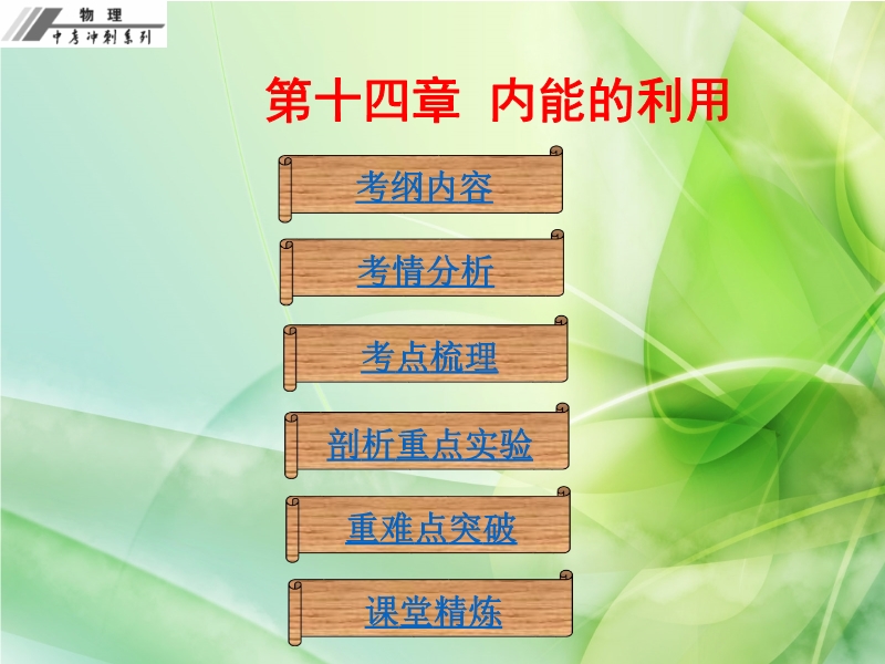 【内容简介】【中考冲刺】人教版2016年初中物理中考复习课件 《第十四章 内能的利用》ppt课件,课件共有36张幻灯片,课件设计了考纲内容;考情分析;考点梳理;剖析重点实验;重难点突破;课堂精炼等栏目,课件重点解析了教材难点认识燃料的热值、热机的工作过程和能量的转化与守恒等。