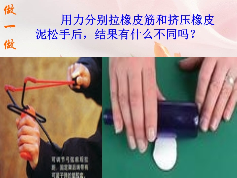 【内容简介】人教版:《7.2 弹力》PPT课件,共由35张幻灯片。主要引导学生通过观察日常生活的现象总结了物体的弹性及弹力产生原因,然后引导学生讨论了弹力在生活中的应用,体现了物理来源于生活又应用于生活的理念。课件最后引导学生讨论了弹簧测力计的原理及弹簧测力计的构造和使用方法等。