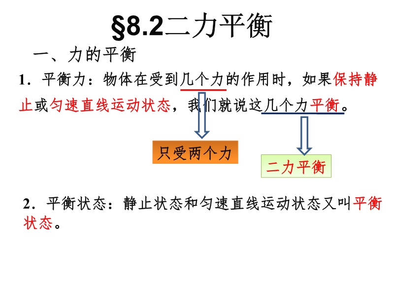 【内容简介】人教版:《8.2二力平衡》PPT课件,共有26张幻灯片,课件主要引导学生认识了二力平衡的概念,模拟演示了“探究二力平衡的条件”的实验,实验现象明显,效果较好。