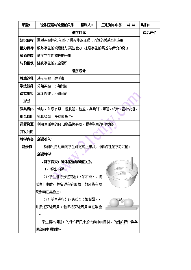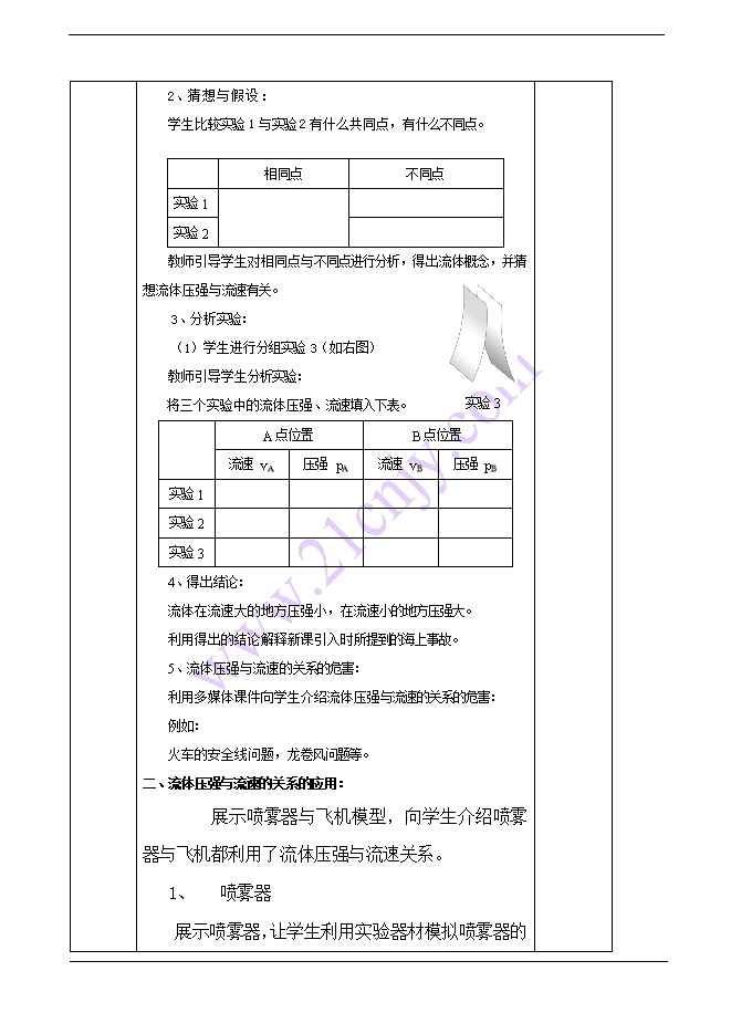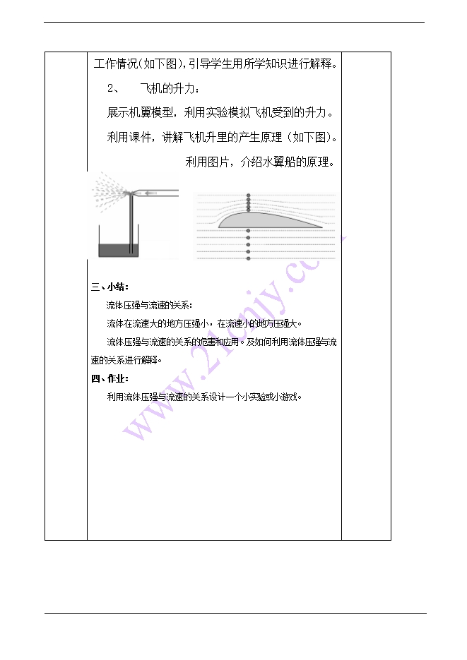 - 7982025春人教版八年级下册物理教学设计:9.5 流体压强与流速的关系(附教学反思)