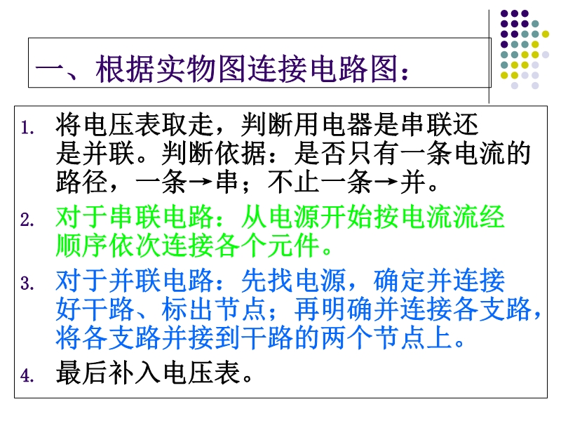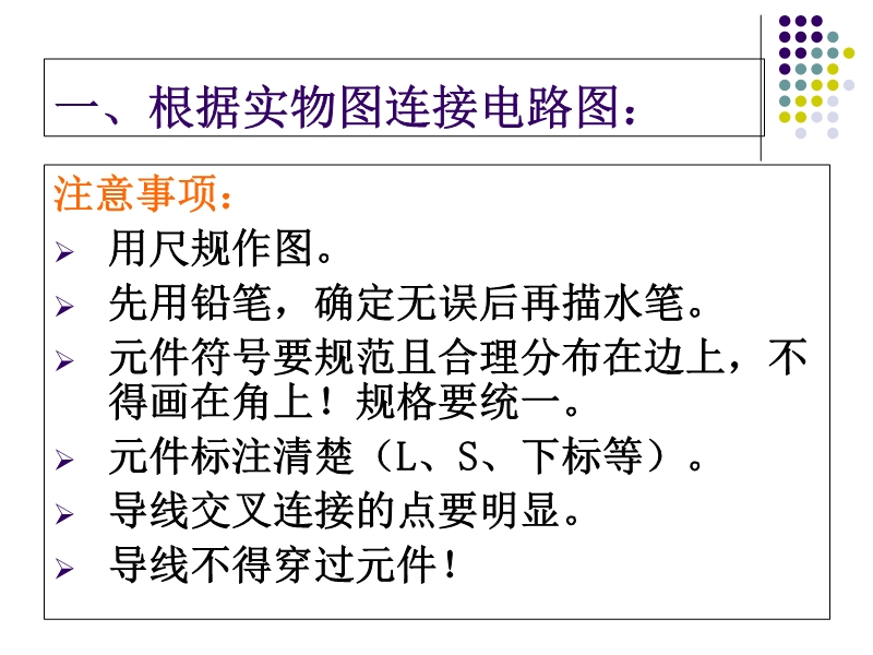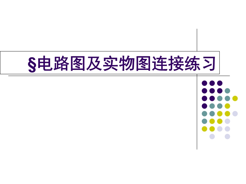 【内容简介】2016中考复习:《电学 电路图及实物图连接练习》PPT课件,课件有20张幻灯片,课件展示了四个方面的内容:1、根据实物图连接电路图2、根据电路图连接实物、3电路分析、4简单电路设计等。