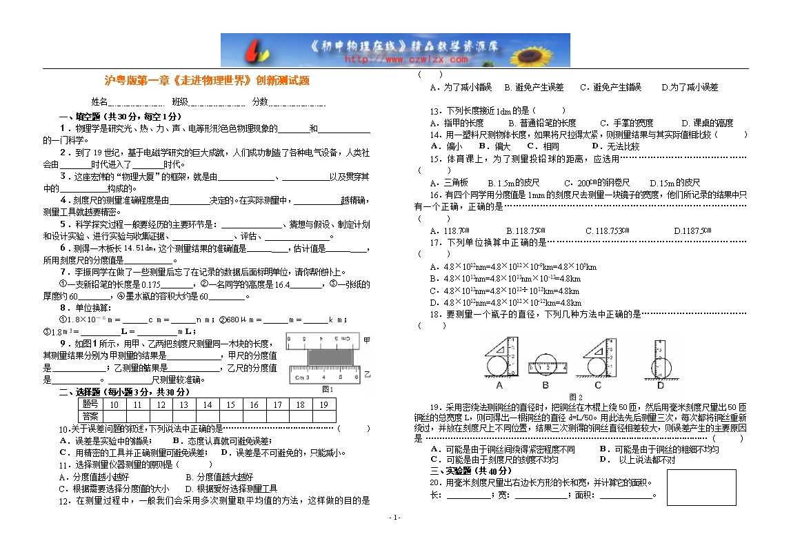 沪粤版第一章《走进物理世界》创新测试卷