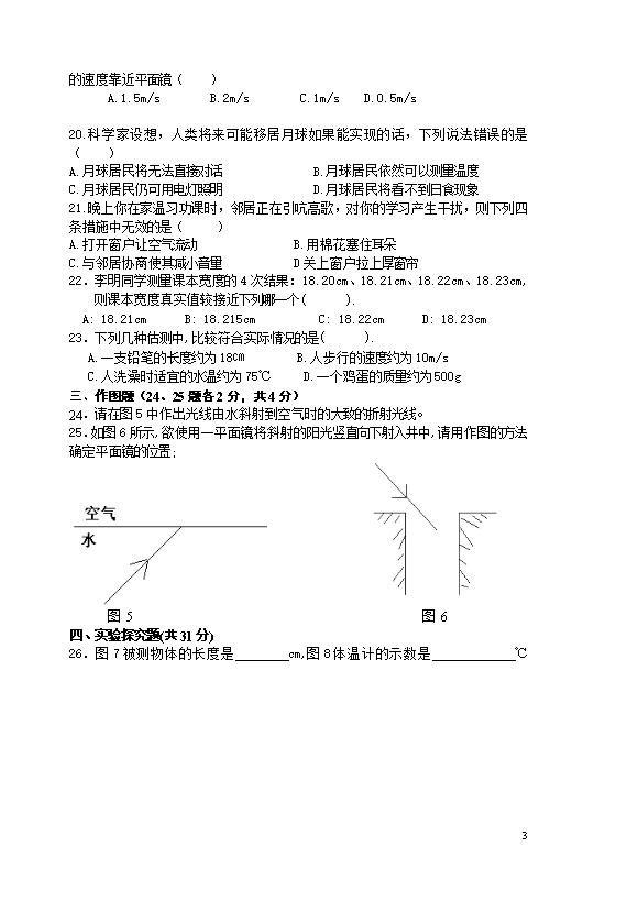 6. 一只小鸟在平静的湖面上飞过,当小鸟距水面3m时,小鸟在湖面的“倒影”是 (填“实”或“虚”)像,它是由于光的 形成的,该“倒影”距小鸟 m。