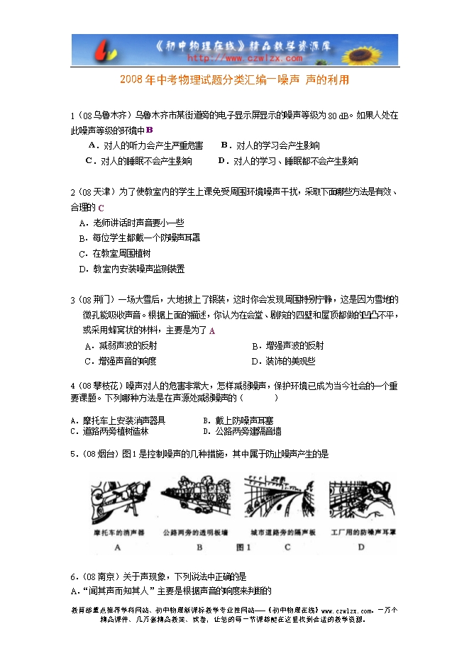 5.(08烟台)图1是控制噪声的几种措施,其中属于防止噪声产生的是