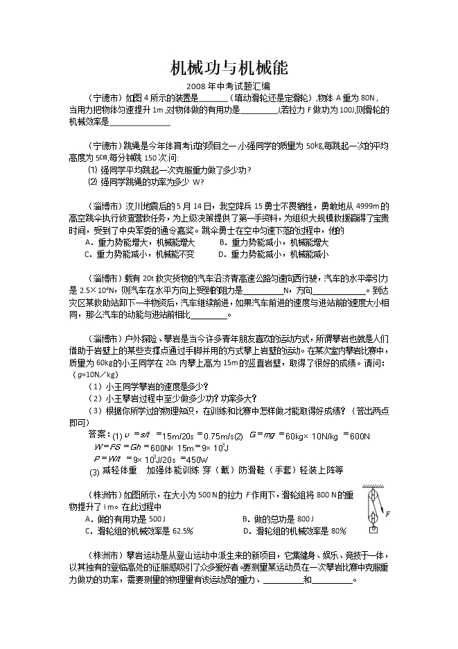 当用力把物体匀速提升1m ,对物体做的有用功是_________J,若拉力F做功为100J,则滑轮的机械效率是_______________