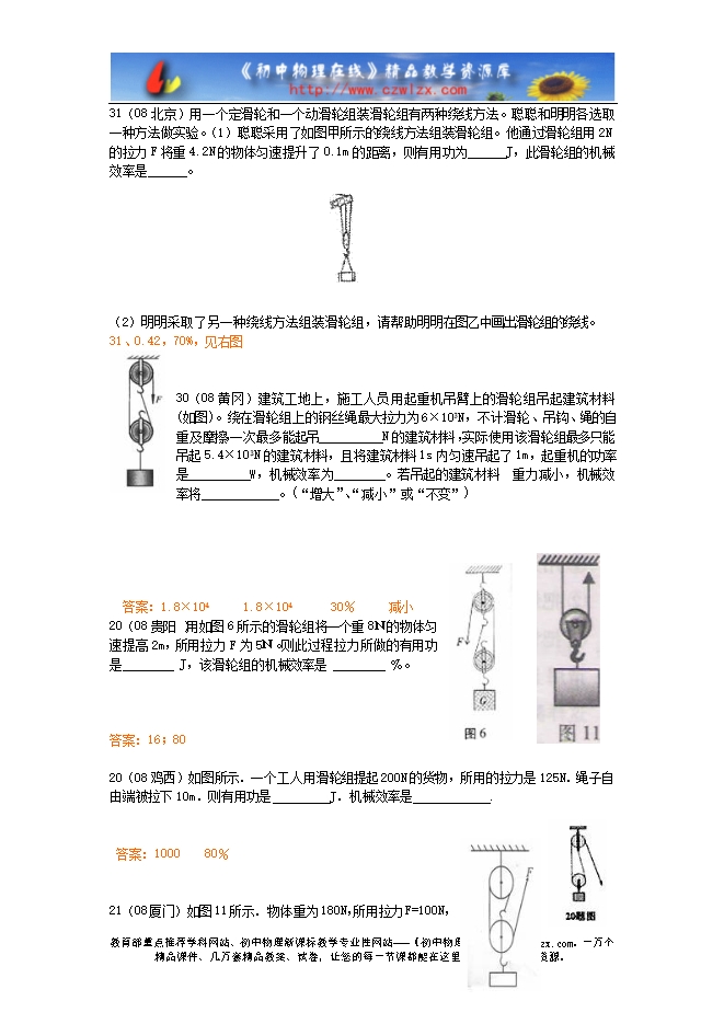 31(08北京)用一个定滑轮和一个动滑轮组装滑轮组有两种绕线方法。聪聪和明明各选取一种方法做实验。(1)聪聪采用了如图甲所示的绕线方法组装滑轮组。他通过滑轮组用2N的拉力F将重4.2N的物体匀速提升了0.1m的距离,则有用功为 J,此滑轮组的机械效率是 。