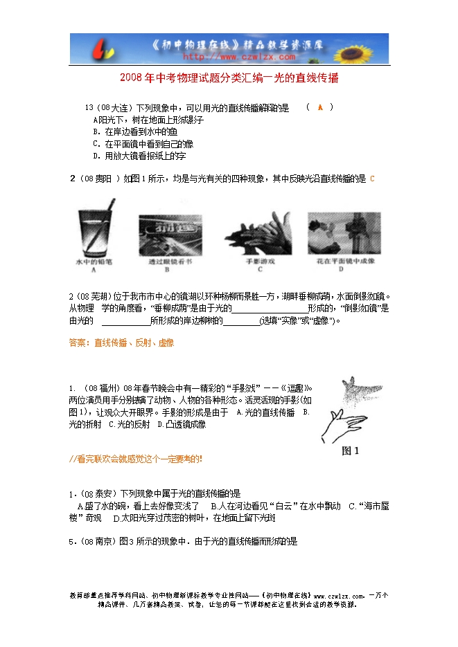 1. (08福州)08年春节晚会中有一精彩的“手影戏”——《逗趣》。两位演员用手分别表演了动物、人物的各种形态。活灵活现的手影(如图1),让观众大开眼界。手影的形成是由于 A.光的直线传播 B.光的折射 C.光的反射 D.凸透镜成像