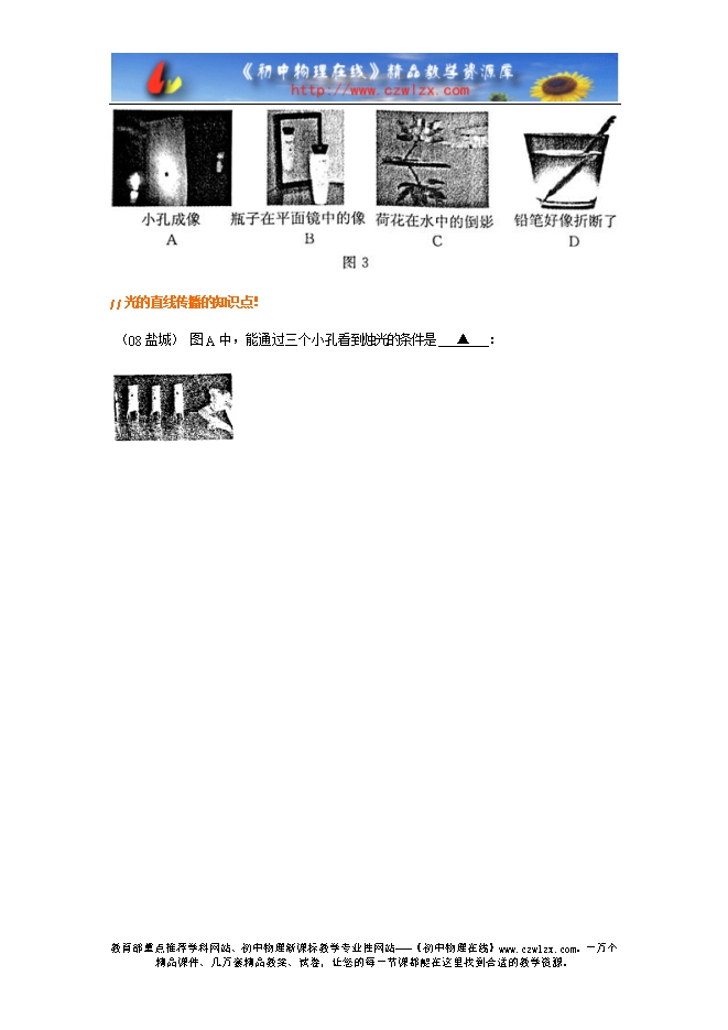 2(08贵阳 )如图1所示,均是与光有关的四种现象,其中反映光沿直线传播的是 C