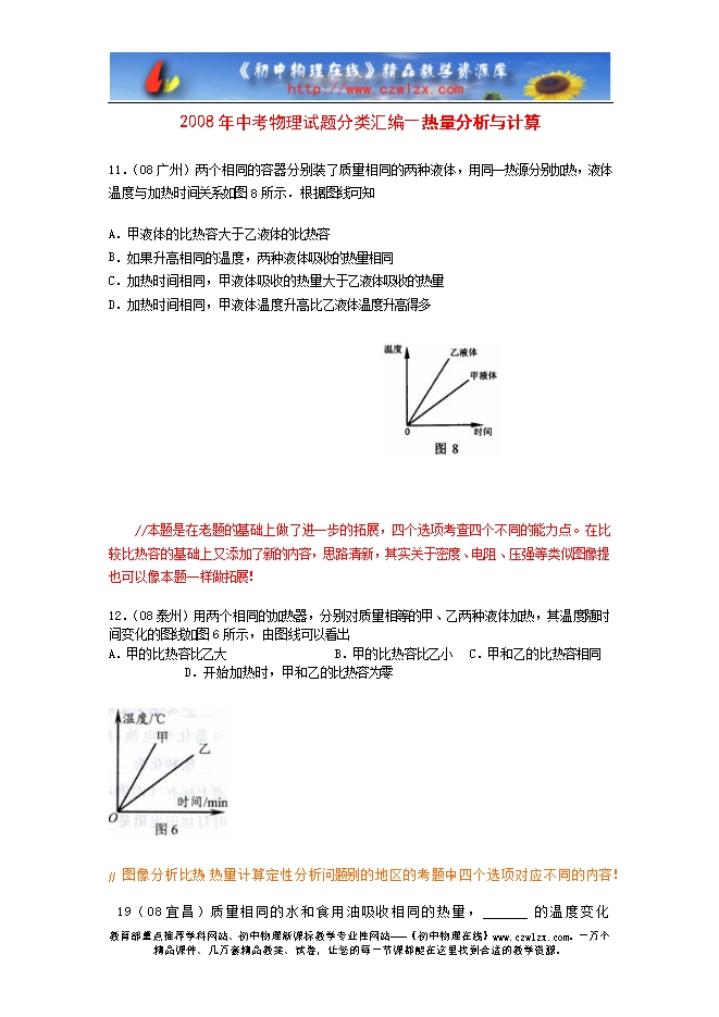 【内容简介】11.(08广州)两个相同的容器分别装了质量相同的两种液体,用同一热源分别加热,液体温度与加热时间关系如图8所示.根据图线可知