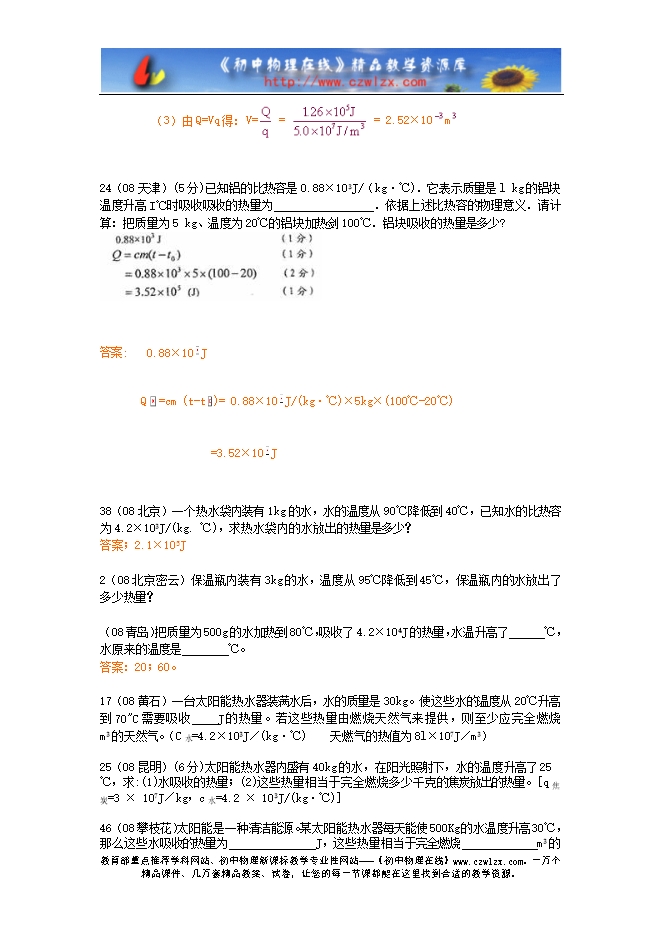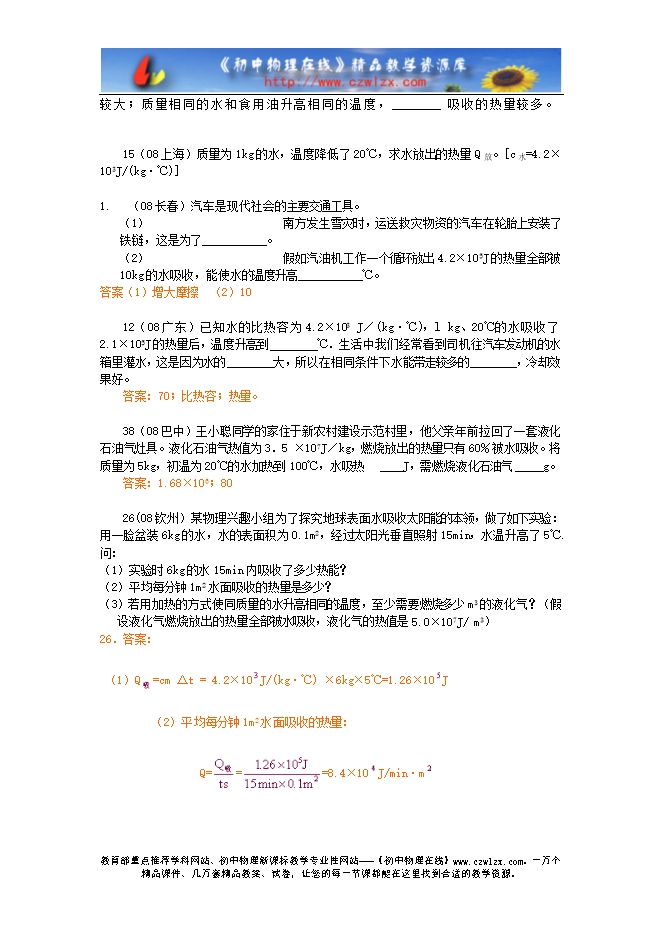 15(08上海)质量为1kg的水,温度降低了20℃,求水放出的热量Q放。[c水=4.2×103J/(kg·℃)]