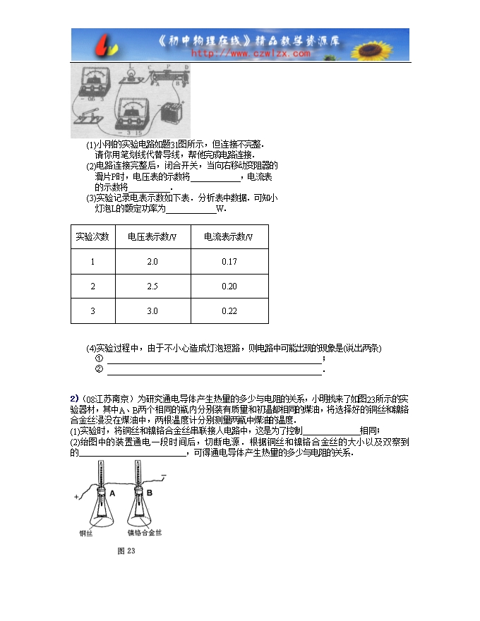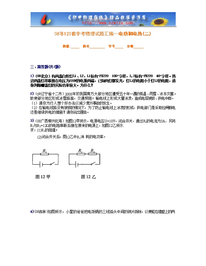 1)(08北京)有两盏白炽灯L1、L2,L1标有“PX220 100”字样,L,2标有“PX220 40”字样。将这两盏灯串联接在电压为220V的电源两端,已知两灯都发光,灯L1的电阻小于灯L2的电阻,请你判断哪盏灯的实际功率较大。为什么?