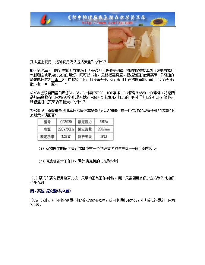 7)(08江西)清洗机是利用高压水清洗车辆表面污垢的机器,有一种CC5020型清洗机的铭牌如下表所示。请回答: