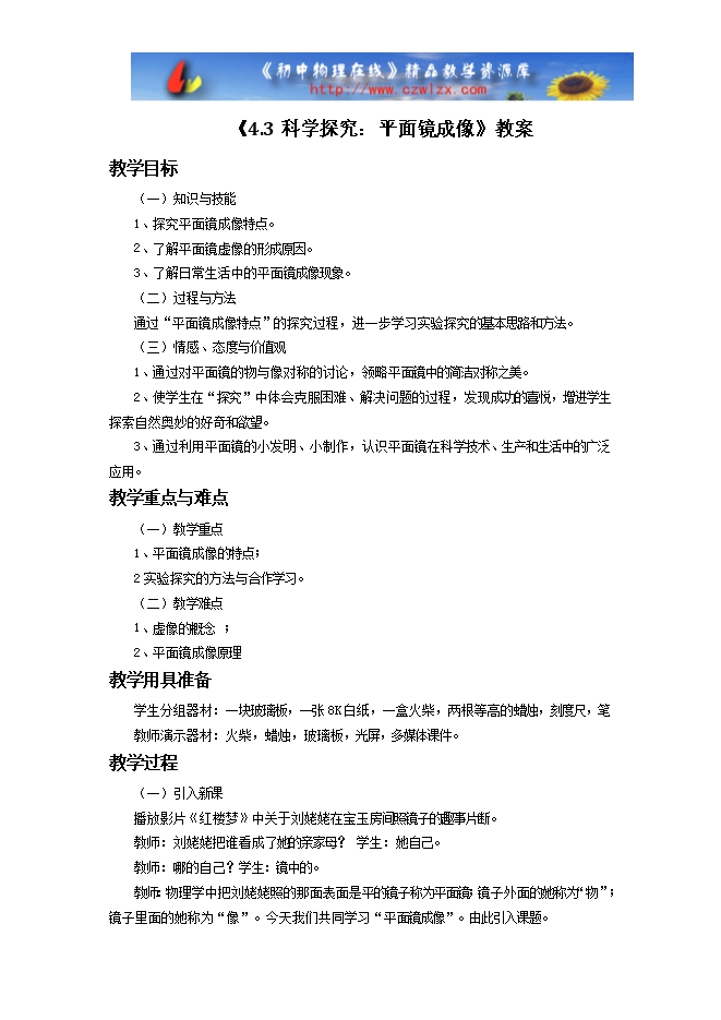 教科版八年级物理《4.3科学探究:平面镜成像》教案
