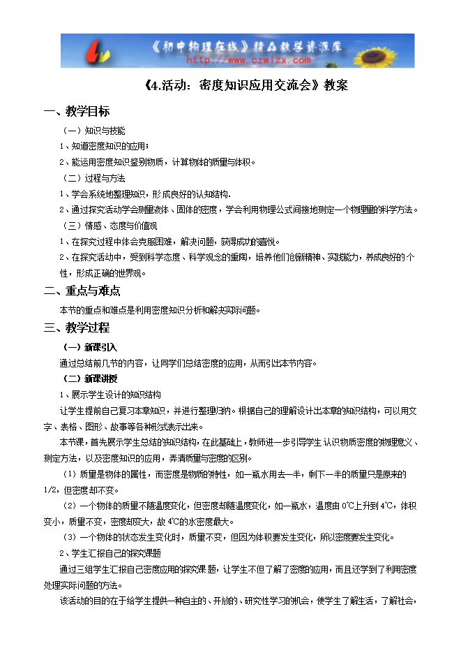 教科版八年级物理《6.4活动:密度知识应用交流会》教案
