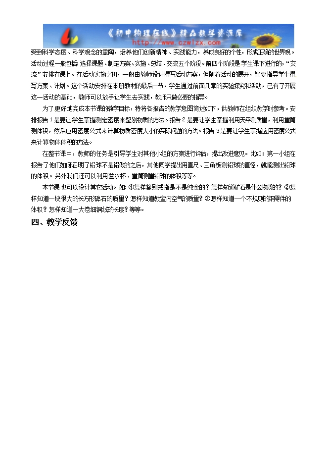 本节课,首先展示学生总结的知识结构,在此基础上,教师进一步引导学生 认识物质密度的物理意义、测定方法,以及密度知识的应用,弄清质量与密度的区别。