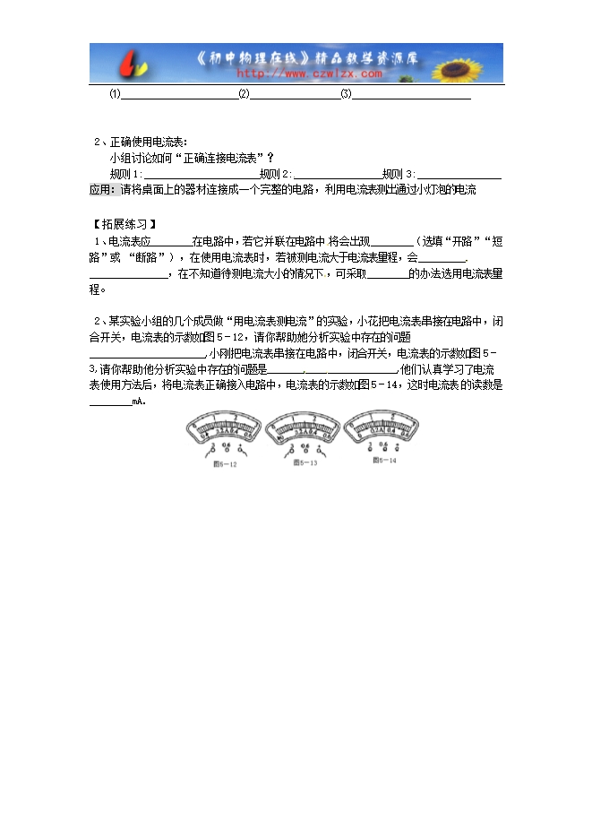 、电流表是用 来测量电流的仪器,它应该______(选填“串联”或“并联”)在电路中,它相当于一根细导线,对电流的阻碍作用很小,电流表接线应______________,电流表量程一般是_______。
