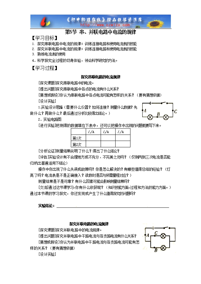 探究并联电路中电流的规律;训练连接电路和使用电流表的技能