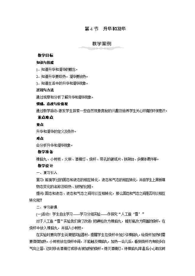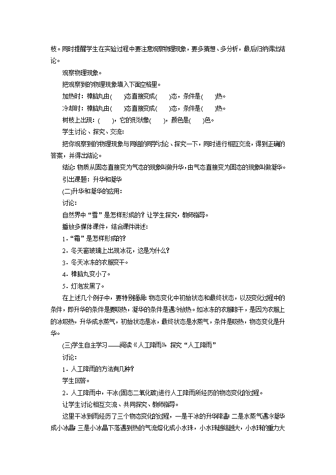 在实验时要向学生说清楚实验器材,提醒学生在烧杯中加少许樟脑丸,给烧杯加热时需要微微加热,小树枝放在烧杯中间,不能触及樟脑丸,加热一会儿后,看到烧杯内有较多白气向上冒,这时移去酒精灯或移去被加热的烧杯。熄灭酒精灯,待樟脑丸降温后小心取出树枝。同时提醒学生在实验过程中要注意观察物理现象,要多猜想、多分析,最后归纳得出结论。