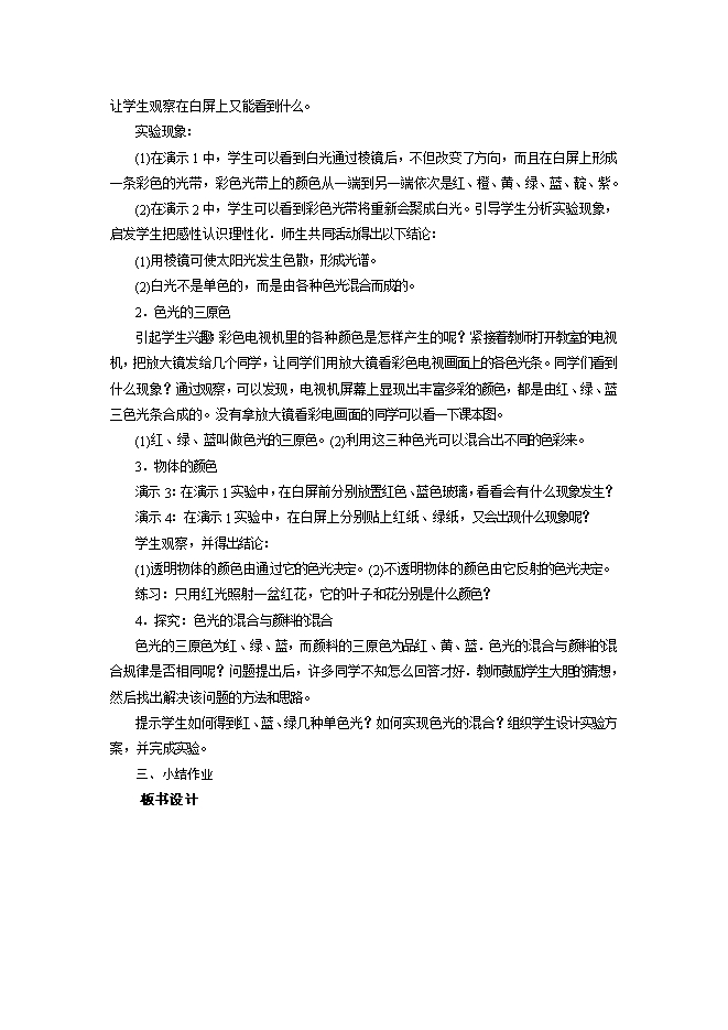 (2)在演示2中,学生可以看到彩色光带将重新会聚成白光。引导学生分析实验现象,启发学生把感性认识理性化.师生共同活动得出以下结论: