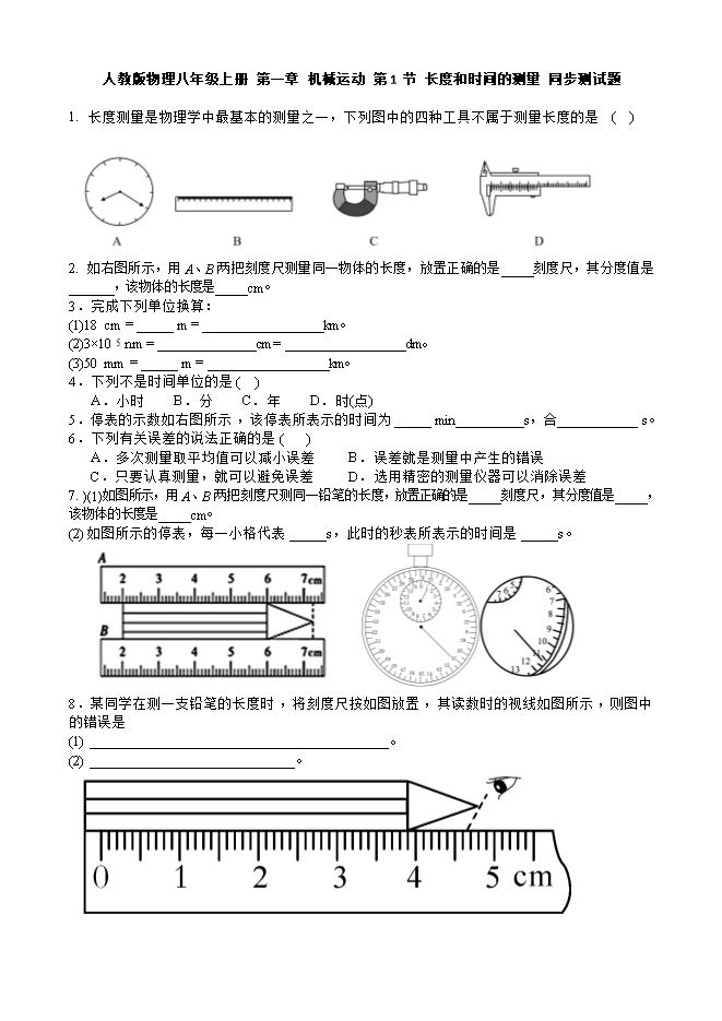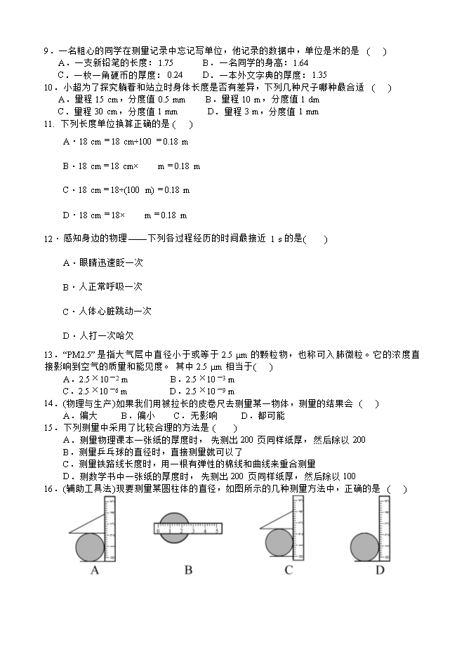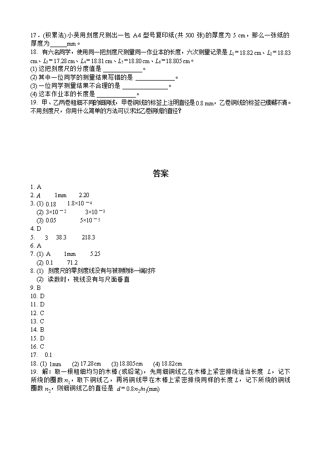 2017年秋人教版八年级物理上册同步测试卷《1.1长度和时间的测量》(含答案)