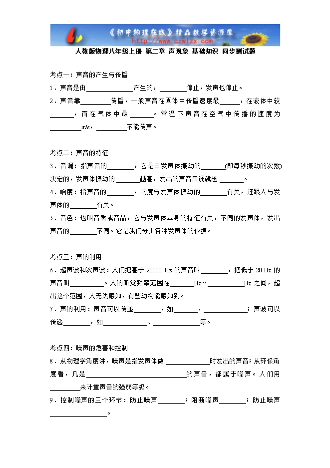 2017年秋人教版八年级物理上册《第二章 声现象》基础知识测试卷(含答案)