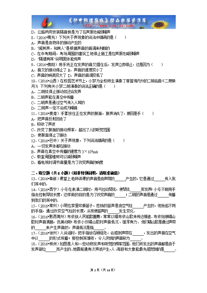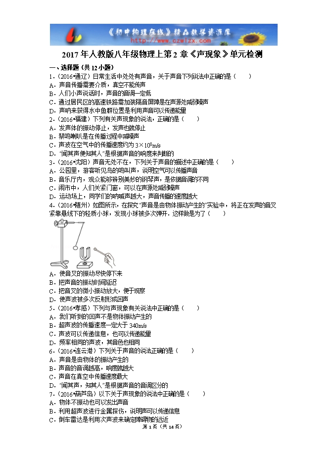 2017年秋人教版八年级物理上册《第二章 声现象》同步测试卷(含答案)