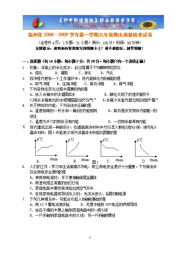- 457福建省福州市2020届九年级上学期期末质量抽测物理试题及答案