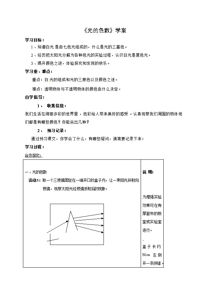 <span style="line-height: 150%; font-family: 宋体;">了解光的色散;知道白光由哪七<span lang="EN-US"><!--[if gte vml 1]>