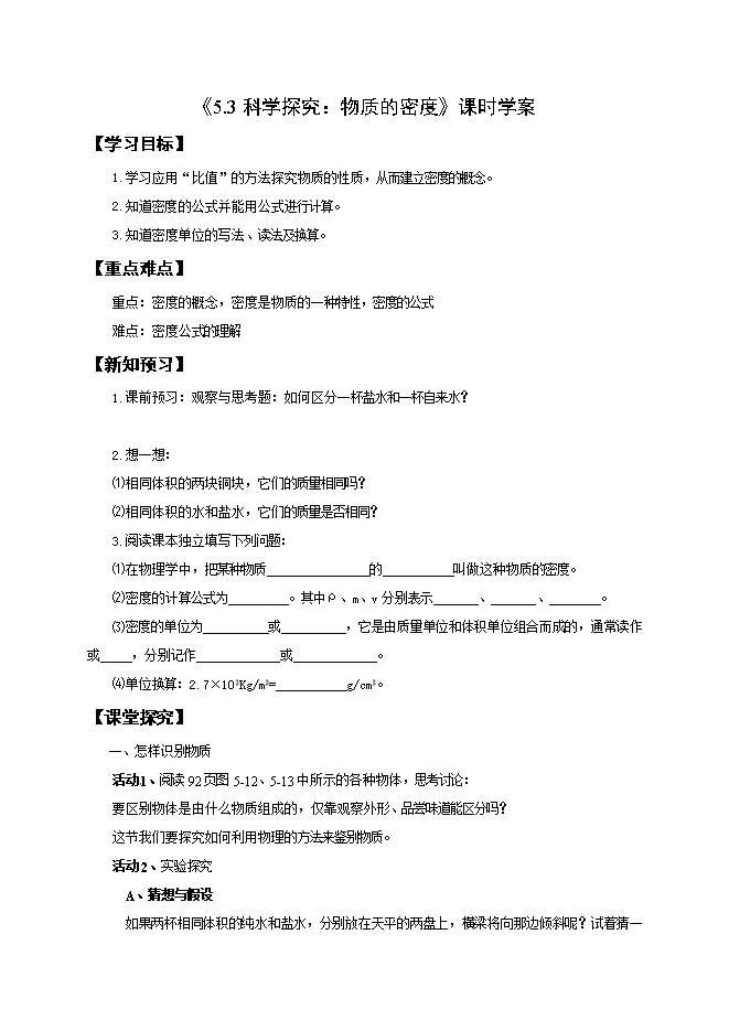 沪科版 八年级物理全册教科书 5.3科学探究:物质的密度