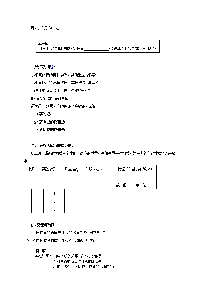 (2)相同体积的水和盐水,它们的质量是否相同?