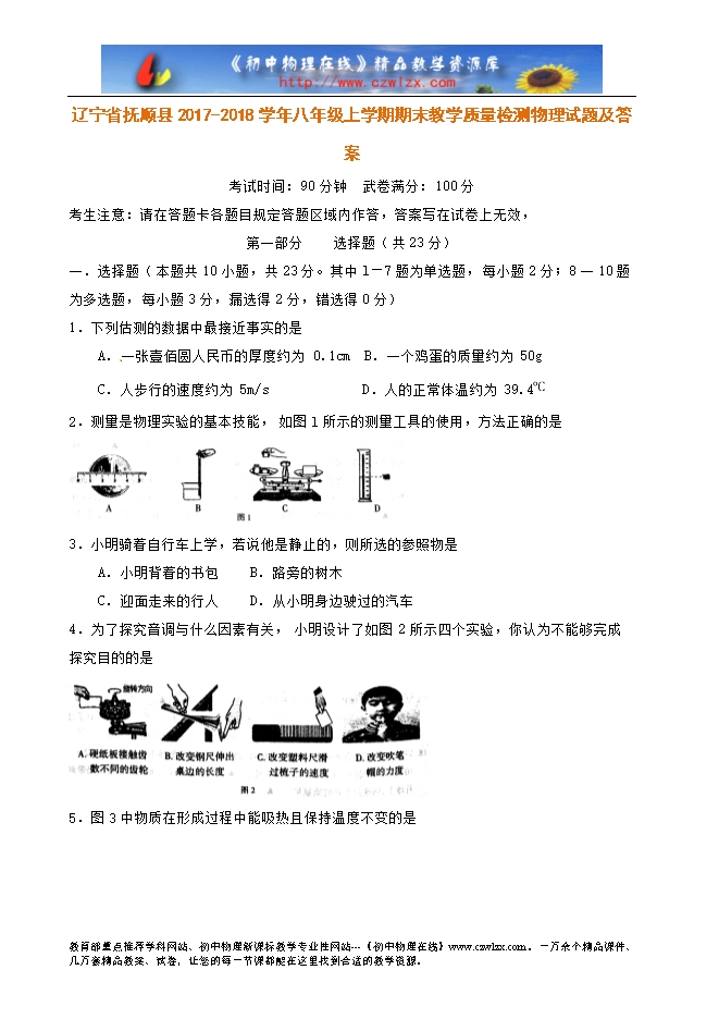 辽宁省抚顺县2017-2018学年八年级上学期期末教学质量检测物理试题及答案