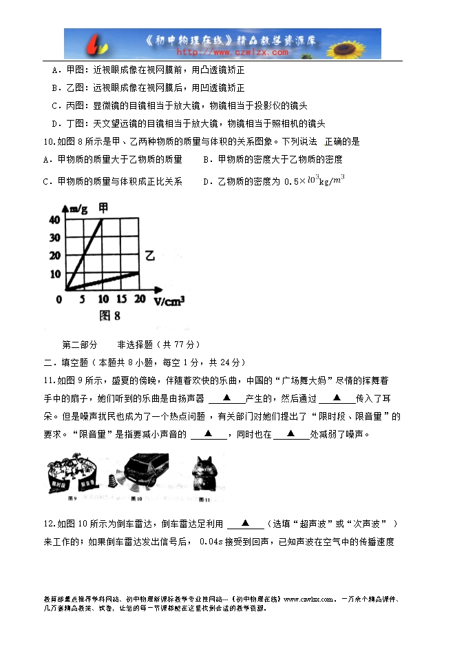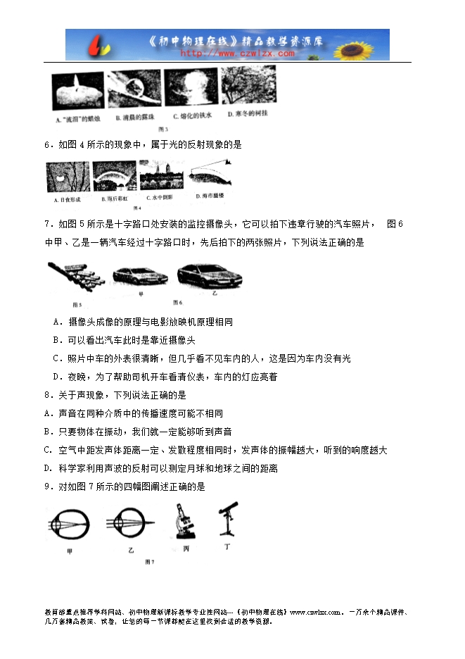 7.如图5所示是十字路口处安装的监控摄像头,它可以拍下违章行驶的汽车照片,图6中甲、乙是一辆汽车经过十字路口时,先后拍下的两张照片,下列说法正确的是