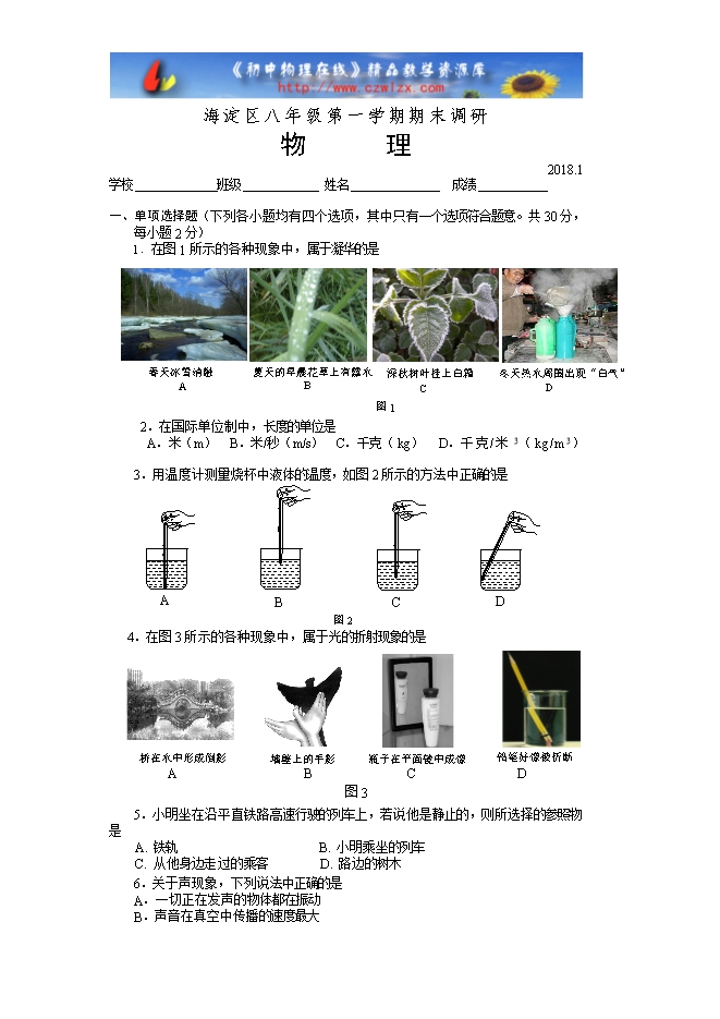 北京市海淀区2017-2018学年八年级上学期期末考试物理试题及答案