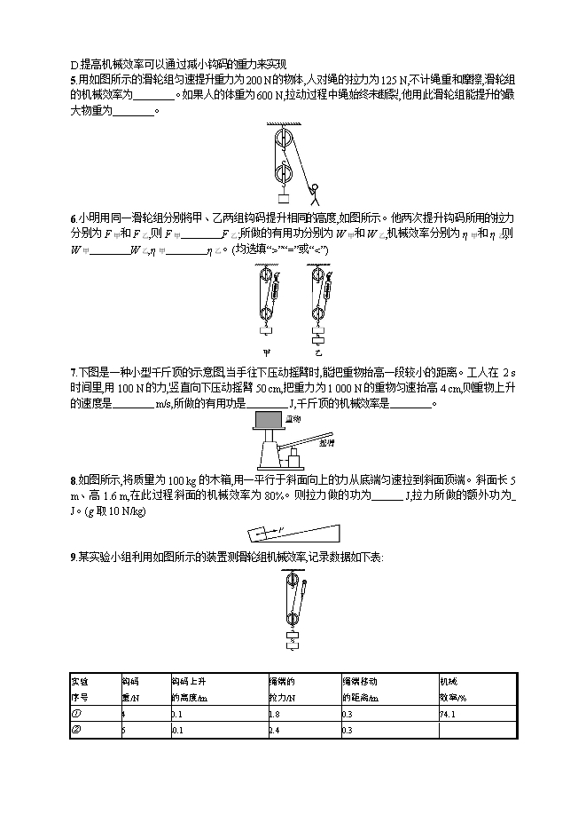 .用如图所示的滑轮组匀速提升重力为200 N的物体,人对绳的拉力为125 N,不计绳重和摩擦,滑轮组的机械效率为 。如果人的体重为600 N,拉动过程中绳始终未断裂,他用此滑轮组能提升的最大物重为 。