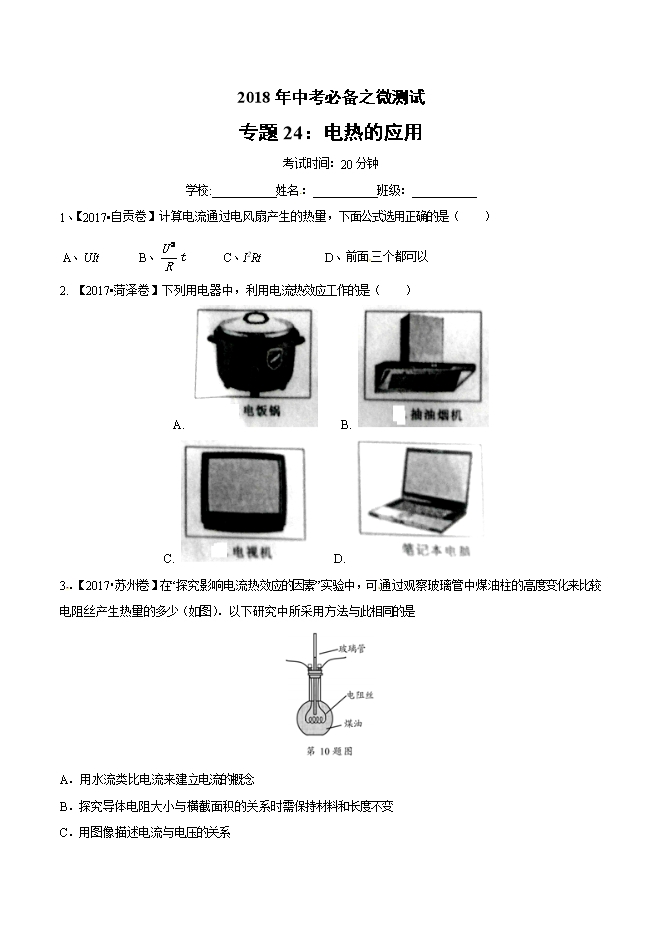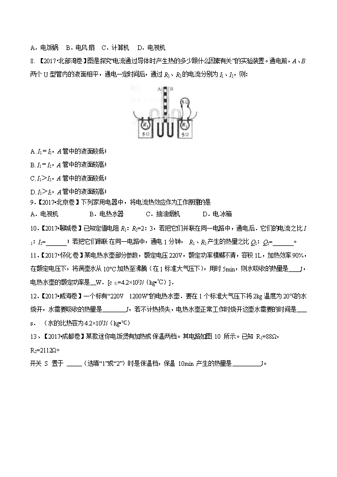 【内容简介】1、【2017•自贡卷】计算电流通过电风扇产生的热量,下面公式选用正确的是( )