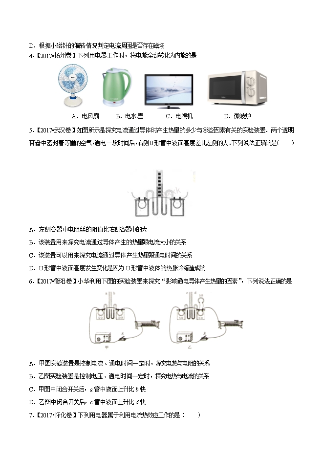 4.【2017•扬州卷】下列用电器工作时,将电能全部转化为内能的是