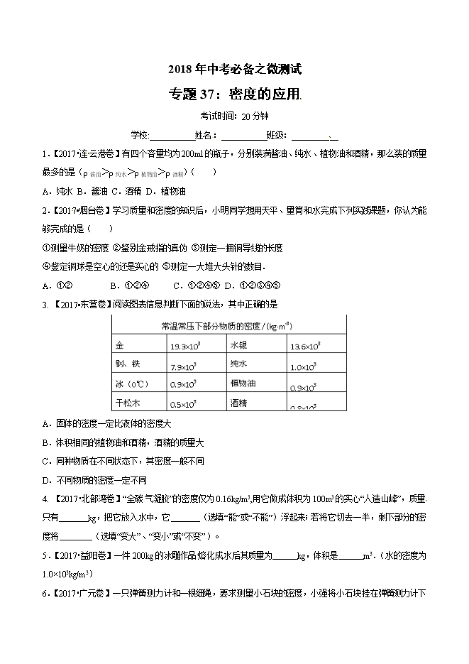 2018年中考物理必备之微测试:专题37 密度的应用(word原卷版和解析版)