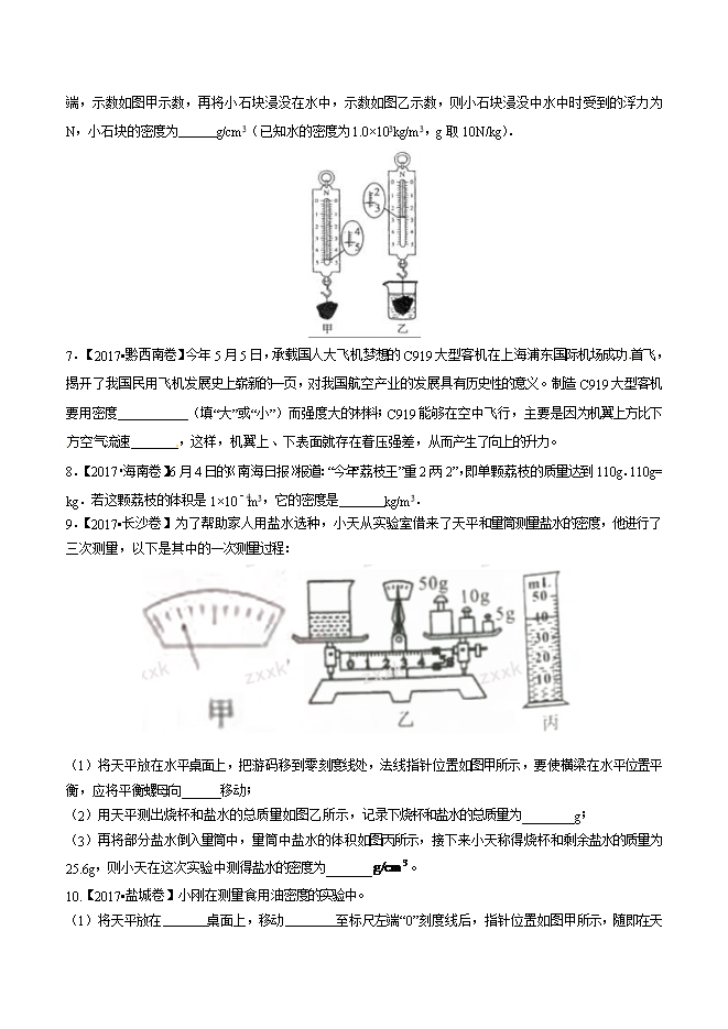 4. 【2017•北部湾卷】“全碳气凝胶”的密度仅为0.16kg/m3,用它做成体积为100m3的实心“人造山峰”,质量只有 kg,把它放入水中,它 (选填“能”或“不能”)浮起来;若将它切去一半,剩下部分的密度将 (选填“变大”、“变小”或“不变”)。