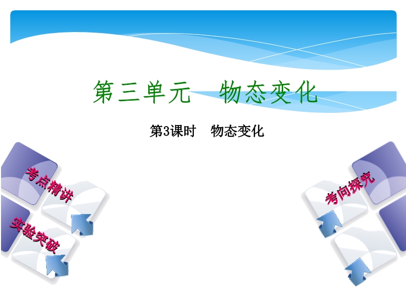 【内容简介】2018届中考物理复习《第三单元 物态变化 第3课时 物态变化》ppt课件+word专项训练共有34张幻灯片,主要围绕物态变化相关知识进行复习,分为知识梳理、典型例题和实验突破三个部分,并配有专项练习,适合各省市复习通用。