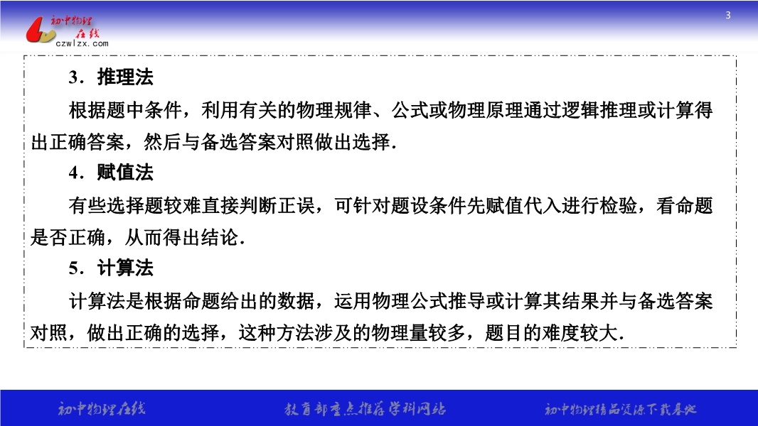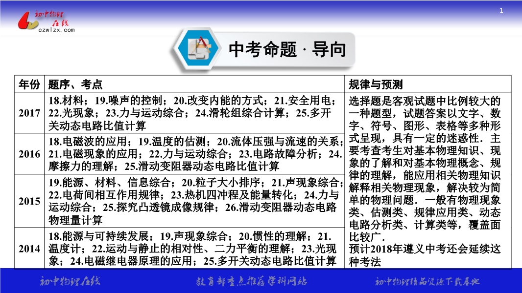 【内容简介】2018年沪科版物理中考复习第二轮专题:《1 选择题》PPT课件,课件有28张幻灯片,课件列举2017年中考试题的基础上,引导学生总结了解法和学法