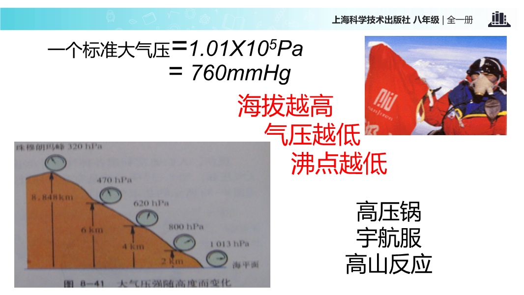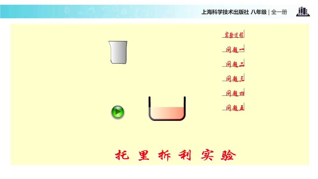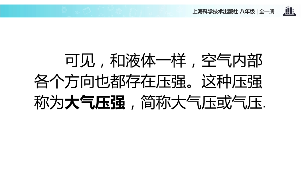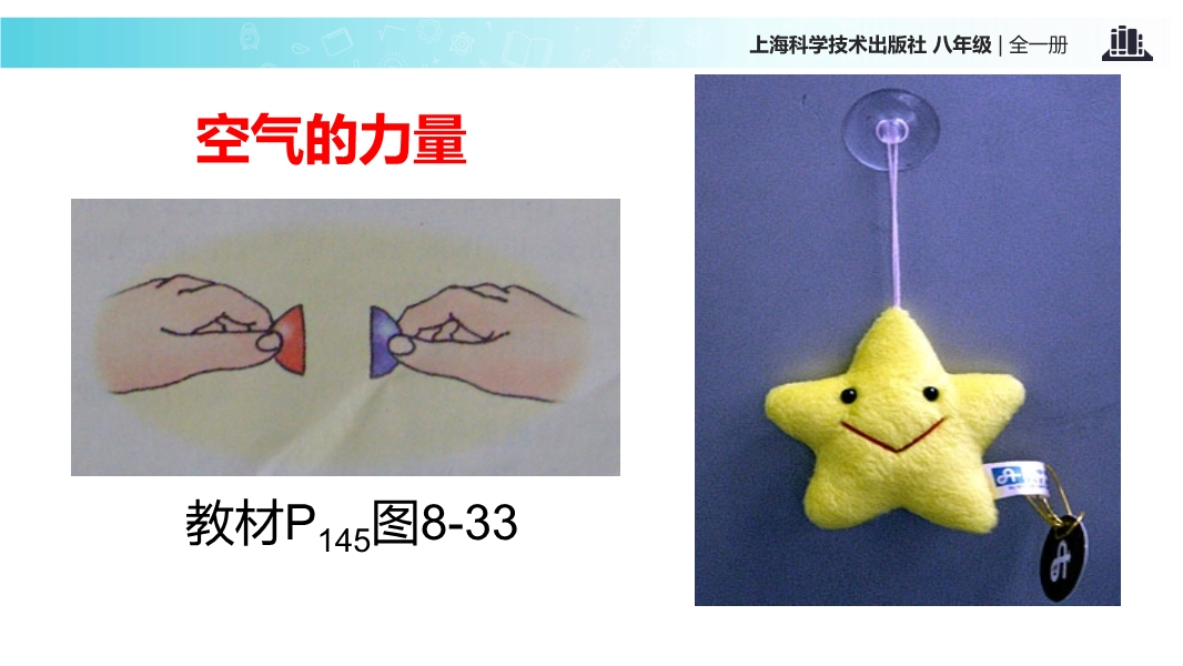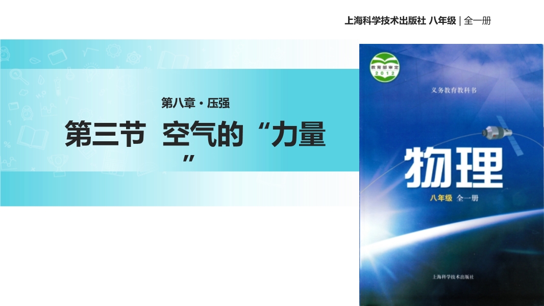 【内容简介】沪科版《8.3空气的“力量”》课件,共有24张幻灯片,课件引导学生通过小实验体验了大气压强的存在,分析了了托里拆利实验,让学生知道了大气压强的测量方法等。