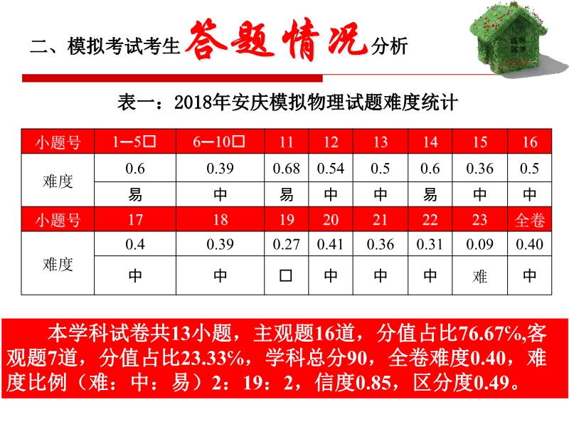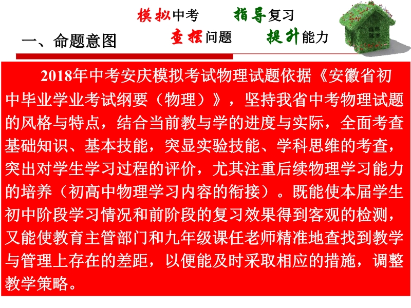 【内容简介】2018年安徽省安庆市中考研讨会:《安庆一模数据的分析》PPT课件,课件分析了一模学生答题情况,同时分析原因,最后提出建议.