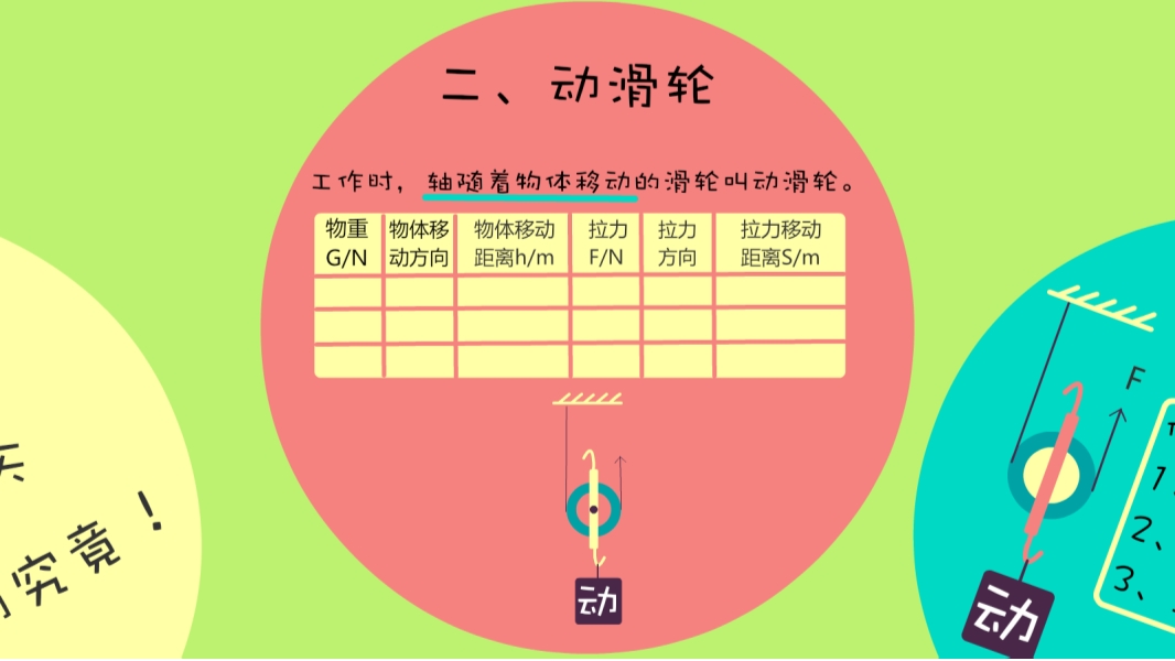 【内容简介】人教版:《12.2滑轮》PPT课件),共有22张幻灯片,课件设计新颖,重在引导学生利用实验探究了定滑轮和动滑轮使用的特点,分析了定滑轮和动滑轮的实质,课件还展示了滑轮组的使用以及绕绳方法等。